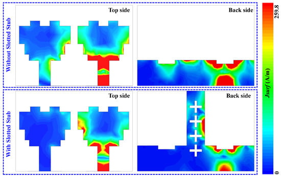 The slotted stubs were used to improve isolation between the antennas. When there was no decoupling network, the surface waves were coupled to the non-excited radiating element resulting in high mutual coupling. On the other hand, when the decoupling structure was incorporated within the elements, one can see that the surface waves and near fields were suppressed in the non-excited antenna. The surface waves and the near fields were concentrated within the decoupling structure resulting in high isolation between the antenna elements. This phenomenon can be observed in Figure 9. The surface current distribution with and without the slotted stubs at 10 GHz is shown in Figure 9.