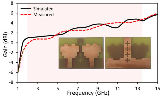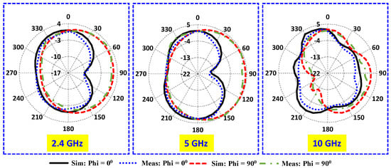 Gain is one of the key parameter of the antenna. The simulated and measured gain of the antenna is greater than dBi with a maximum value of dBi at 12 GHz. The simulated and measured gains are in good agreement for the whole operating bandwidth as shown in Figure 10. The far-field patterns of the proposed system is shown in Figure 11. The radiation patterns are shown for three different frequencies, i.e., , 5, and 10 GHz. The comparison between the simulated and measured - and -plane radiation characteristics are shown in Figure 11. The results were in good agreement.
