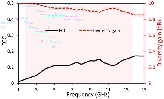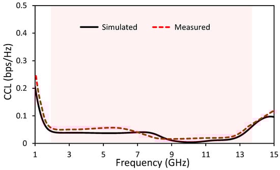 The simulated ECC and DG for the proposed system is shown in Figure 12. It can be seen that the DG was more than dBi and the ECC was less than within the band of interest. One of the important MIMO system parameters is Channel Capacity Loss (CCL). The measured and simulated CCL of the proposed system is depicted in Figure 13. It is observed that CCL was less than bps/Hz for the whole operating bandwidth.