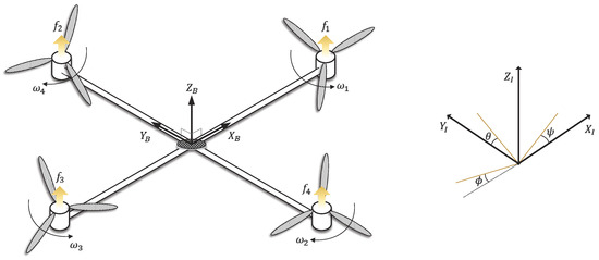 where denotes the forces generated by four rotors of the quadrotor system (Figure 1). where is the rate of i-th rotor, e.g., , of the quadrotor system. b and l are the lift coefficient and the length from the center of mass to the center of each rotor, respectively. is considered as the drag coefficient.
