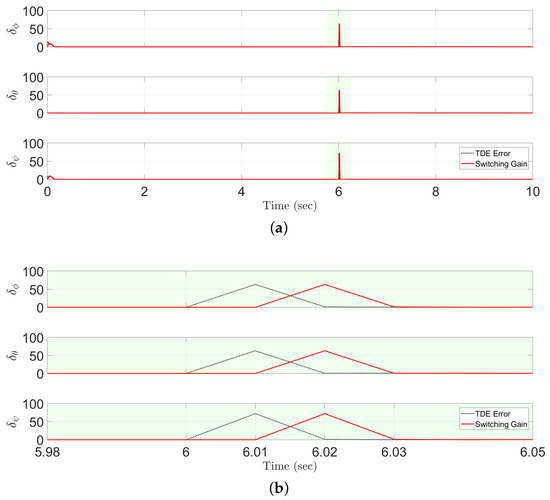 Figure 3 shows the switching gains of the proposed ETDC scheme that employ one-sample delayed information of the TDE errors. It can be observed that the magnitude of the switching gains is similar in that of the TDE errors. Therefore, the proposed ETDC scheme can appropriately respond to undesirable side effects generated by the TDE errors. In Equation (13), it provides a result in the desired error dynamics as follows: