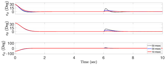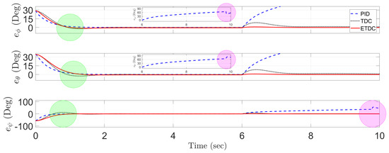 The objective of these simulations is to make the roll, pitch, and yaw angles follow the desired trajectories that is set to zero for all angles. To demonstrate the effectiveness of the proposed ETDC scheme, we employ
