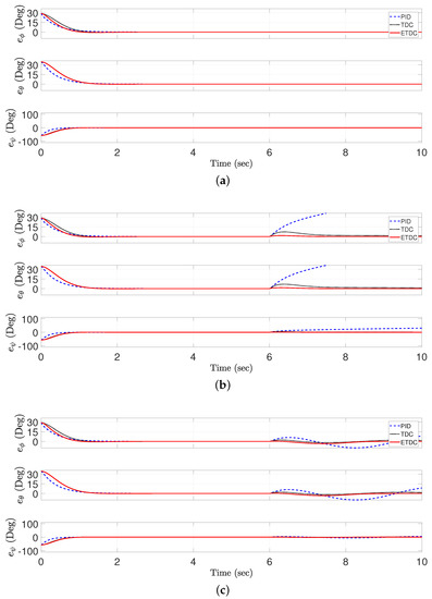 Figure 5 shows trajectory-tracking errors of the PID control scheme, conventional TDC scheme, and the proposed ETDC scheme in three kinds of simulations: