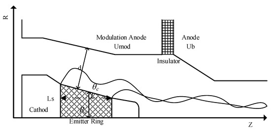 However, a higher α will cause the limit current to decrease, and when the operating current is close to the limit current, it will cause the reversal of the electron beam, which drastically affects the emission and interaction efficiency. It seems very critical to obtain an optimal α value through theoretical analysis. To obtain a satisfactory electron beam quality, the operating current cannot exceed 0.5 of the limit current [9,17,21].