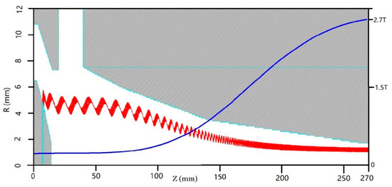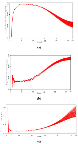 Based on the theory of the MIG [18,27], fundamental design factors were calculated and given in Table 5. Particle simulations are important to verify the beam performance of any specific gun design. 2D Magic code was adopted to optimize the parameters of the MIG and Magic was considered as a convinced software to calculate the particle motion and beam–wave interaction, which includes the space charge effect. The calculation in the Magic 2D code was performed with a mesh size of 0.3 and 0.1 mm in the z and r direction. The geometry model and electron trajectory cooperated with the axial magnetic field and were shown in Figure 5. Beam voltage and current were 10 kV and 460 mA, respectively. Electron momentum is defined by P = m × v, perpendicular and longitudinal momentum were shown in Figure 6a,b. Energy transferred to the transverse direction from the axial direction due to the adiabatic compression. When the transverse-to-axial velocity ratio reached the maximum, as shown in Figure 6c, electrons leave the electron area and then turn into the interaction area. Specific parameters of the electron beam are shown in Table 6, with 2.55 velocity ratio and 9.33% perpendicular spread ratio.