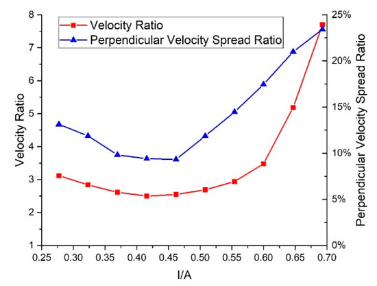 Based on the theoretic calculation in Figure 1, when the limiting current is 0.824 A, the operating voltage is 10 kV and the velocity ratio is 2.55. Due to the working current being generally selected as half of the limit current, numerical simulation is adopted to investigate the sensitivity of the beam current around the 0.416 A for α and spread. From Figure 7 it can be seen that when the current is 0.416 A, the velocity ratio is the lowest, with velocity spread of 9.4% and α 2.55. This is also self-consistent with the previous maximum velocity ratio and velocity spread relationship in Section 2.3 Equation (12). As shown in Figure 7, with the increasing of the beam current, the velocity ratio would decrease, but when it exceeds a value, the velocity spread would boost rapidly.