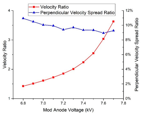Taking into consideration both the experiment and the theory, the electrical field of the cathode can be convenient to modulate to obtain a satisfactory electron beam. So, particle simulation is adopted to analyze the sensitivity of the modulating voltage for the velocity ratio and velocity spread when beam voltage and current are 10 kV and 0.46 A, respectively. What can be clearly seen in Figure 8 is the continual growth of the velocity ratio and slight fall of the perpendicular velocity spread with the increasing modulating voltage. Therefore, the simulation is consistent with the theory study.