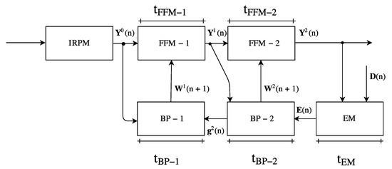 where is the output signals matrix from the previous layer. The represents the output of the current layer and is the activation function of the current k-th layer. As previously said, a few other matrices are devised as part of the BP calculation and some of them store the calculation results from Equation (8).