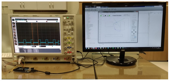 The tests were executed with the C running at a clock of 16 MHz. The results were obtained by setting the level of a digital pin of the ATMega-2560 to HIGH, executing one of the modules and setting the same digital pin logical value to LOW, and measuring the time of logic HIGH on an oscilloscope for this digital pin. This can be easily seen on Figure 2, and a picture of the HIL assembly is shown in Figure 3. Figure 4 gives a closer look at the oscilloscope measurements, taking into account all the modules being measured according to their duration of execution for the XOR validation case described below.