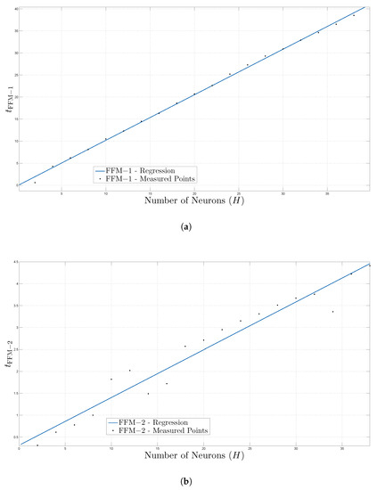 (a) Execution time of FFM-1 by number of neurons in the hidden layer, . (b) Execution time of FFM-2 by the number of neurons in the hidden layer, .