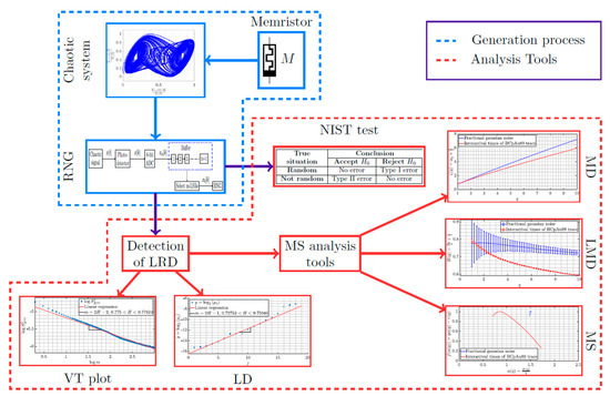 The scheme of Figure 1 represents the methodology used in this investigation. Initially, the memristor device is introduced, which allows it (from its non-linear behavior) to generate the chaotic systems implemented as physical signals for the proposed RNG model, which synthesizes the traces of data to be analyzed. Subsequently, the NIST test bench is used to measure the degree of randomness of the synthesized data [7]. Some sequences were estimated with the Hurst parameter (H) for the detection of LRD from two tools: the variance-time diagram (VT) and the log-scale diagram (LD). The first calculates the moments of aggregation and the autocovariance of the process X[k] [33]. The second computes the average of the detail coefficients of the discrete wavelet transform [25,26]. If these traces have long-range dependence, they can be classified as single—or multifractal with multiscale (MD) and linear multiscale (LMD) diagrams [25,27]. Similarly, the multifractal spectrum (MS) allows analyzing fractal processes from the Legendre transform [10], providing information on the data trace, such as its fractal dimension, spectrum width and information dimension, among others [34,35,36,37].