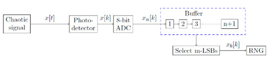 The block diagram of Figure 4 shows the process for an RNG dependent on a chaotic signal (for example, emitted by a laser beam) [27]. In this investigation the chaotic signal will be generated by the two systems presented previously.