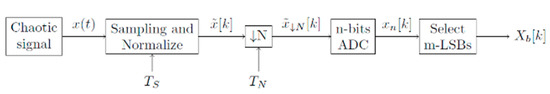 The resolution of the analog to digital converter (ADC) block depends on the n-bits of the converter, allowing to distinguish values closer to each other with a larger number of bits. This suggests that at a high sampling rate, an ADC with low resolution will allow the conversion of consecutive equal data, decreasing the randomness of the generator. Therefore, it is necessary to add an intermediate block that reduces the sampling rate depending on the number of bits of the converter to eliminate unnecessary information from the chaotic signal sampled. A normalization block is also added in order to decrease the sampling rate of the multitasking processor. The calculation of this rate is shown in Equations (5) and (6).
