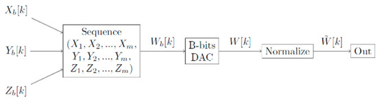 In order to grant more randomness to the RNG, inspired by [25], the generator combines the first three state variables of each chaotic system, sampled with the process of Figure 5 and generates a unique binary sequence. Following, a b-bits DAC and another normalization block are inserted at the output to deliver discrete numbers in a wider range to the binary (W[K] ∈ [0, 1]). Figure 4 is extended to Figure 6 with these modifications.