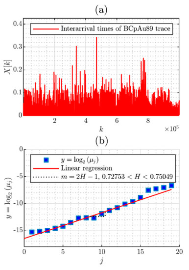 The graph of j versus is nown as the log-scale diagram [35]. The value of H is an approximation that depends on the amount of detail coefficients used and the number of octaves used in the linear regression. Taking the plot exposed in [52], in Figure 7 shows the series of times with LRD (Figure 7a) and the estimation of the Hurst parameter with the LD between octaves 3 and 14 (Figure 7b).