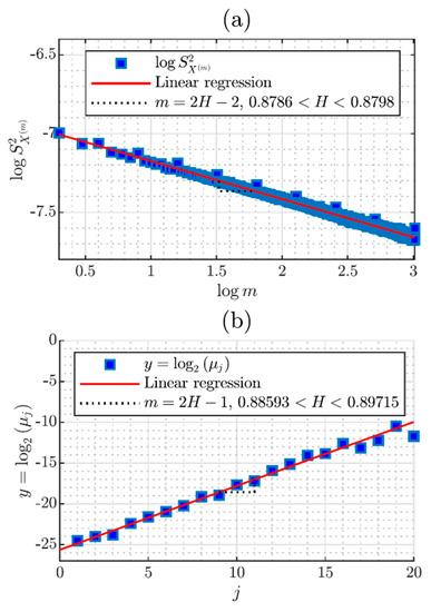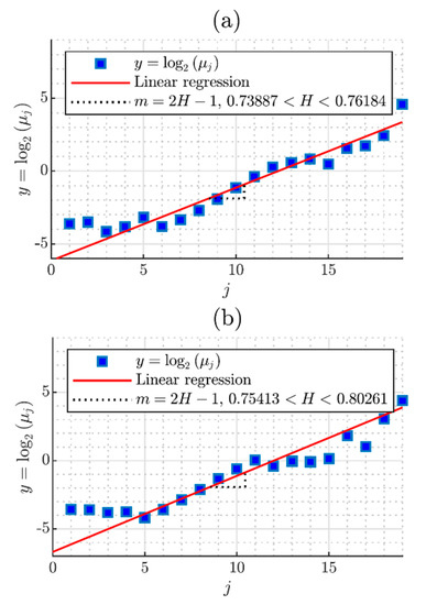 where nj is the number of detail coefficients in the octave j and µj ≈ E [|dx(j,k)|2]. Since the second moment of the detail coefficients follows a power law with exponent 2H − 1, it is possible to estimate the Hurst parameter, using the estimator (Equation (14)) [36]: