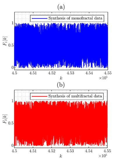 Figure 11a,b shows the traces Synthesis of monofractal data and Synthesis of multifractal data in a time interval of 4.5 × 105 < k < 4.55 × 105. The length of each trace is one million data.
