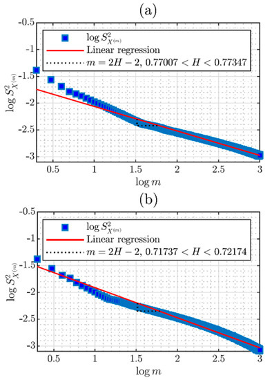 For processes with LRD, the estimator of Equation (15) follows the law of powers shown in Equation (16) [34].