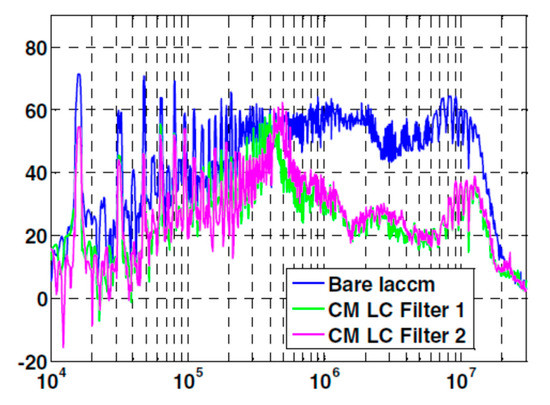 Several papers can be found about this point when single-phase converters are considered [19,20]. As an example, Figure 1 shows measured DM–CM noise transformation due to asymmetries in an EMI filter [19]. As far as three-phase converters are studied, however, few analytical contributions are available in the literature. Nevertheless, mode conversion in three-phase converters is well documented by experiments. For example, the experimental results reported in [21] show clearly that the three-phase LC filter is a critical component. In fact, in case of slight filter asymmetry, the DM resonances can be measured as resonances in the CM current. As an example, Figure 2 shows the amplitude spectrum of the measured CM current in the three-phase motor drive system reported in [21]. The blue curve was measured without filter, whereas the green and the magenta curves were measured for two different values of the DM inductances (i.e., 3.5 and 2.5 μH, respectively) of a DM–CM LC filter. The resonances of the DM circuit (i.e., 380 and 450 kHz corresponding to the two values of the DM inductance, and 50 nF capacitance) were clearly measured in the spectrum of the CM current. This is a clear experimental evidence of DM-to-CM noise conversion. Recognizing this point is crucial for a proper filter design. In fact, if DM-to-CM noise conversion is not recognized, unnecessary overdesign of the CM filter could be implemented.