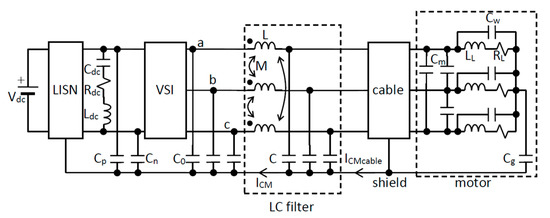 Let us consider the three-phase motor drive system represented in Figure 3 and consisting in a dc-fed three-phase inverter, a line impedance stabilization network (LISN), a dc-link capacitor, a CM/DM LC filter, a shielded cable, and an induction motor. The LC filter is realized by means of a CM choke whose leakage inductance provides DM filtering, and three star-connected grounded capacitors [21]. The following derivations, however, have general validity and can be readily adapted to different filter realizations. The cable is represented by a lumped RLC circuit, whereas each motor phase is represented by a series RL connection and a parallel capacitor to take into account high-frequency effects of windings.