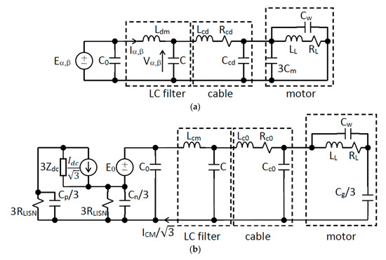 Clarke equivalent circuits of the three-phase motor drive system represented in Figure 3. The α and β circuits have the same topology (a), whereas the zero-component circuit (b) takes into account the interconnection of the three-phase circuit with the single-phase part of the system.