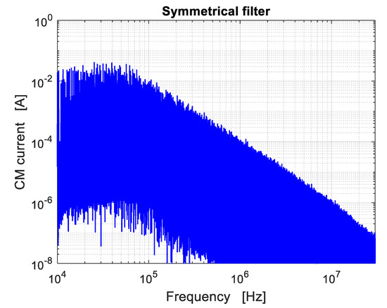 Amplitude spectrum of the CM current in case of filter with symmetrical components.