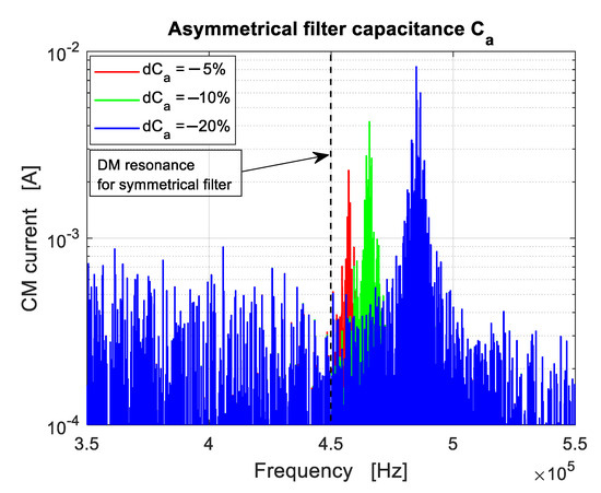 Figure 6 shows the effect of a deviation of the filter capacitance with respect to its nominal value . According to (8), a negative deviation results in a positive relative increase in the resonance frequency of the α circuit. Moreover, according to (9) such resonance is injected into the CM circuit with increasing magnitude with the deviation . This is confirmed in Figure 6, where three different percent values of were selected (i.e., , , and ). The corresponding shift in the DM resonance frequency (i.e., ) are given by , , and , respectively. According to the eigenvalue analysis derived in Section 3.1.1, similar results can be obtained when the asymmetrical capacitance is either or .