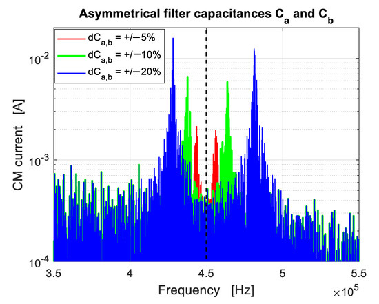 Amplitude spectrum of the CM current in case of asymmetrical filter capacitances and . Opposite deviations between a and b were assumed (i.e., ). Three different percent values for the relative deviations were considered (i.e., , , and ).
