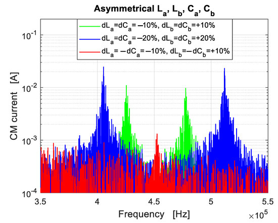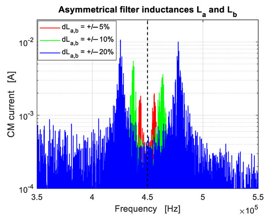 Amplitude spectrum of the CM current in case of asymmetrical filter inductances and . Opposite deviations between a and b were assumed (i.e., ). Three different percent values for the relative deviations were considered (i.e., , , and ).