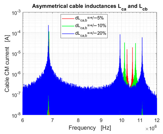 Figure 10 shows the amplitude spectrum of the cable CM current (see in Figure 3) for different deviations of the cable self-inductances. This set of simulations was performed to show how the DM circuit can inject current into the CM circuit at any system asymmetry (i.e., not only the LC filter). In case of cable asymmetry, the DM resonance involving the cable leads to current injection into the cable CM circuit. According to Figure 4a, the cable is responsible of a DM resonance corresponding to its DM inductance (i.e., the difference between the self and the mutual inductances) and the total capacitance consisting in the sum of the cable capacitance and the parasitic capacitances and (in fact, at high frequencies the branch can be ignored). Thus, the frequency of the DM resonance is given by . The self-inductance deviations were selected such that , and three different values were selected for (i.e., , , and ). According to the corresponding frequency separation of each couple of peaks were 300 kHz, 600 kHz, and 1.2 MHz. This is confirmed by Figure 10, where another spectral line can be clearly seen at 6.9 MHz. Such spectral line is independent of cable asymmetry since it is related to the resonance of the CM circuit (see Figure 4b): , where .