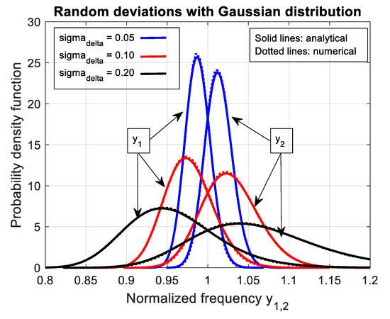 The probability density function (PDF) of (30) can be obtained through the theorem of the transformation of random variables [26]. By taking into account that, as mentioned before, can be approximated by Gaussian random variables, the PDF of the two normalized resonance frequencies are given by: