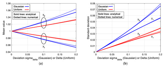 Analytical results derived in Section 3 allow accurate evaluation of DM resonances injected into the CM circuit in case of known asymmetrical values of the filter components. When we are interested in the effects of component tolerance, however, a statistical approach is more suited to the objective. The statistical analysis of the eigenvalues (17) and (25), and the related resonance frequencies (21) and (26), will be derived in this Section by treating all the deviations (i.e., and ) as random variables. Two cases will be investigated, corresponding to two different statistical distributions for the random variables : Gaussian and Uniform distributions. In order to obtain unitary and normalized results, the following transformation of random variables will be investigated: