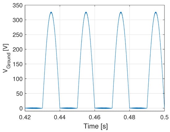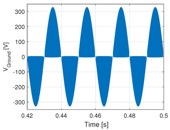 As an example, Figure 10 shows the expected ground voltage waveform. During the positive half-wave its value is very low, and it is mainly determined by the voltage across the semiconductor devices in on-state and the inductive part of the output filter. During the negative half-wave, the grid voltage shape can be recognized, but without the high-frequency switching components.