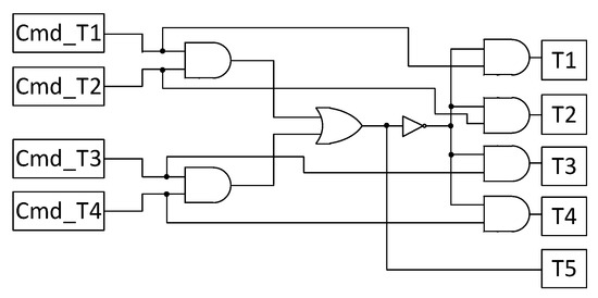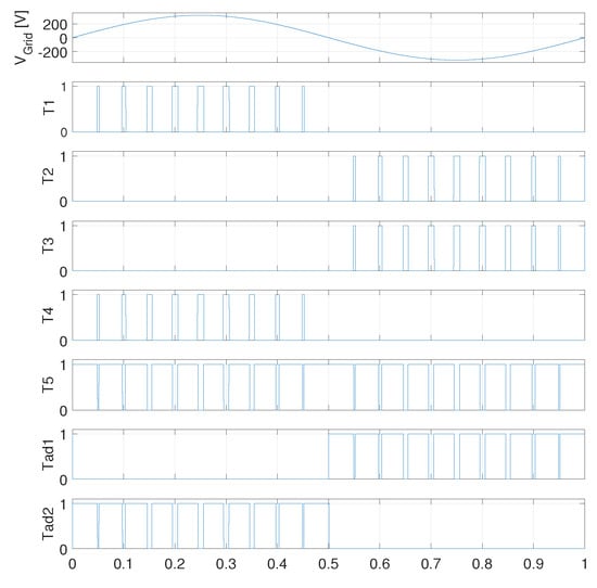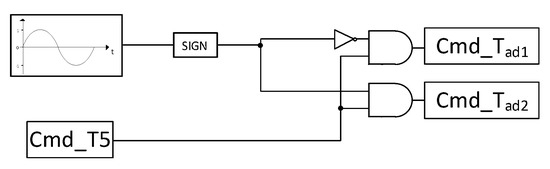 The operating principle relies on the joint action of T5 and the low-power devices. During the zero state, T5 is on and the H-bridge devices are switched off. This operating point effectively decouples the electrical grid from the DC source, and reduces the ground leakage current. However, the full-bridge output terminals remain floating with respect to the grid generator. For this reason, the two additional switches and connect the output terminals to the negative side of the DC panel, with the objective of limiting the high-frequency oscillation across the parasitic capacitance represented by . Only one of the two additional switches is active for each half-wave: is used during the positive half-wave, and during the negative half-wave, respectively. Since some reactive power handling capability is often required for the MICs, a bidirectional device is preferred for the decoupling devices and . Figure 8 shows the schematic block diagram for the generation of the PWM commands for and . For the sake of clarity, the PWM signals for a grid voltage period are depicted in Figure 9 where all full bridge signals of the CSI5 (T1-T5) and the additional switches ( and ) are shown.