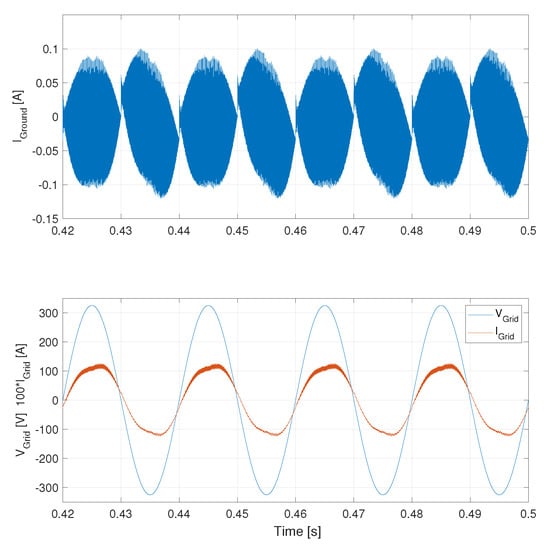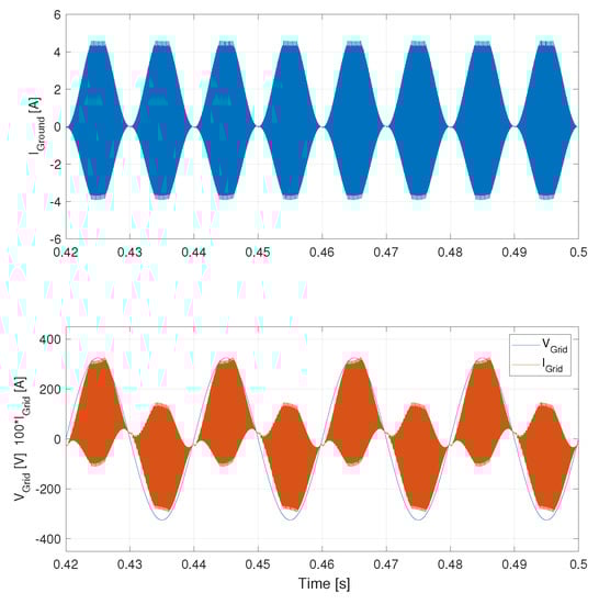 The overlap time (see Figure 3) was inserted before the transition command of every transistor. In the simulations, the modulation index K (see Figure 2) was kept equal to 0.23. No common-mode filters were introduced in the electric circuit. Without any degradation of the power quality caused by equivalent parasitic capacitance, the injected power into the grid is equal to 221 W. Figure 12 shows that the grid voltage and injected grid current were characterized by a strong distortion due to the presence of an unacceptably high ground leakage current in the case of basic topology.