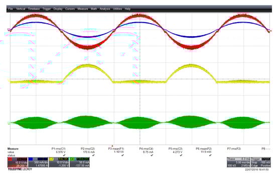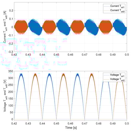The currents of the clamping switches and are very low, as Figure 14 shows, together with their blocking voltage. The RMS current flowing on and are equal to 32 mARMS and 27 mARMS, respectively. The two current levels are different because of different resulting current paths, shown in Figure 11.