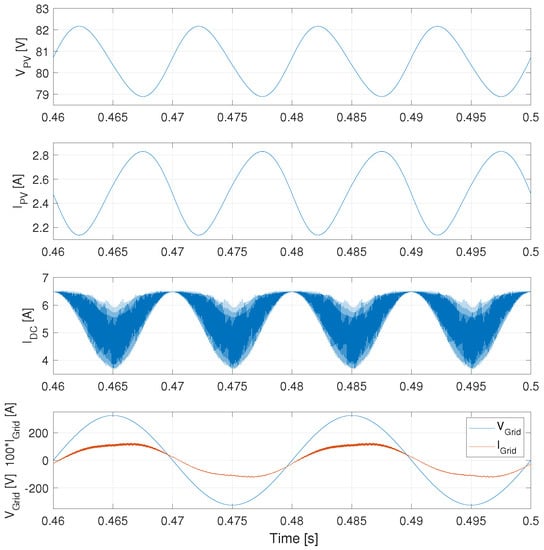 Simulation results with PV panel and DC input current regulation. From top to bottom: PV panel voltage; PV panel current; current on ; grid voltage (blue) and output current (red) waveforms.