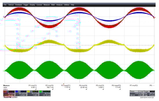 In the preliminary experimental evaluation, the tests were carried out in stand-alone mode, and the grid was substituted by a load resistor . The converter was supplied by a DC power supply with a resistor connected in series in order to emulate the PV source I/V characteristic when operating in current control mode. A capacitor with the value described in Table 4 connected between the neutral and the negative terminal of the DC supply was used to simulate the effect of the parasitic capacitance. The ground leakage current was measured with a current probe on the wire connecting this capacitor.
