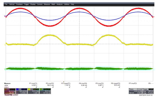 Figure 13 shows the same signals of Figure 12 in the case of a proposed CSI5 topology. The strong reduction of the ground leakage current is clearly visible, together with noticeably lower distortion in the injected current. The phase displacement of the injected current with respect to the grid voltage is due to the output filter reactive power, as previously discussed. The asymmetry in the peaks of the ground leakage current is caused by the asymmetry of the ground voltage, as described in Table 1.