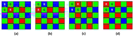CFA demosaicking methods use an array of filters of different wavelength to capture the information necessary to create a color picture. A well-known filter array is the Bayer mosaic, which separates the wavelengths of the incident light into its red, green and blue (RGB) components following a specific pattern. Bayer patterns usually incorporate twice the number of green filters than red or blue filters to sample the green channel at a higher rate. This distribution of colors is chosen due to the fact that the human eye is more sensitive to green hue variations []. According to the mentioned distribution of color filters, the four most commonly used RGB Bayer patterns are illustrated in Figure 1.