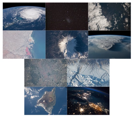 Every space-related image has been randomly selected from the NASA image and video library [] avoiding the repetition of similar images to obtain a representative subset of space images (see Figure 3).