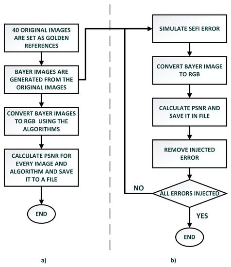 From the previous paragraph, it can be drawn that related works are focused on developing new patterns, algorithms, or methodologies that mainly improve the state of the art in terms of image quality. Some studies perform a quality evaluation of several demosaicking algorithms and others that assess the effect of Gaussian noise on the demosaicking process [,] but, to the authors’ best knowledge, there are no methodologies to characterize both patterns and algorithms in the presence of soft errors aiming to develop fault-tolerant algorithms or intelligent systems.