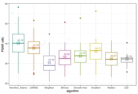 These fault injection campaigns were repeated for each Bayer image until all the PSNR values were obtained. As a practical example of the methodology, the results obtained for the eight interpolation algorithms explained in Section 2 are presented next.
