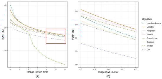 These results showed that the Hamilton–Adams algorithm was the best one in terms of PSNR, followed by the LMMSE, Gradient, Smooth Hue, Bilinear, Median-based, and CDI-based. The worse PSNR was obtained with the Neighbor algorithm. The Hamilton–Adams and the LMMSE algorithms outperformed the rest of the algorithms because they were developed implementing more advanced strategies to deal with demosaicking artifacts such as noise-caused color artifacts in the demosaicking process []. This implies that, in a standard scenario without errors (or where errors were negligible), the Hamilton–Adams algorithm would be the best choice if the final image quality was to be maximized. However, as will be discussed in the following subsections, the best algorithm in the absence of errors may not be the best option in a harsh environment where errors are likely events.