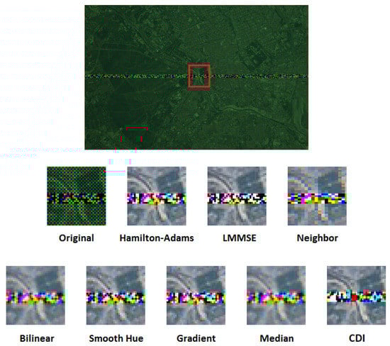 To illustrate the methodology explained in the next section, we have selected eight well-known demosaicking methods: Neighbor, Bilinear, Smooth Hue, Gradient-based, Median-based, Hamilton–Adams, directional linear minimum mean square-error estimation (LMMSE), and a method based on color difference interpolation (CDI). These interpolation algorithms have been chosen to cover a range of algorithms from the simplest one (e.g., Neighbor), to more advanced algorithms (e.g., CDI-based), and even those used in commercial digital cameras (e.g., Gradient-based). There are, indeed, more advanced algorithms that can also be tested, but this subset was chosen since they are described exhaustively in the literature [,,,] and their source code is easily accessible. A brief explanation of the selected algorithms is presented below for the sake of completeness.