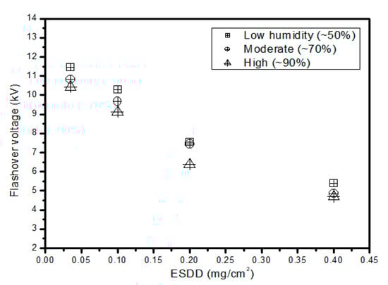 The effect of relative humidity on critical flashover voltage is shown in Figure 4. The relative humidity was varied within the climate chamber, while temperature and NSDD were kept constant. Samples with different ESDD values were tested. The critical flashover voltage decreased as humidity and ESDD increased. This may be due to the increase in pollution constituent dissolving in the humid air surrounding the insulator.