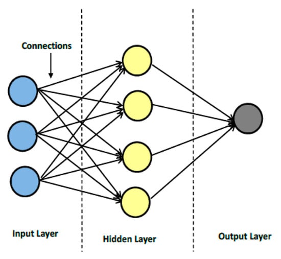 The main processing entity in the ANN model is the neuron. ANN contains many neurons which are linked to each other through specialized information-carrying pathways known as interconnections. There can be multiple inputs to a single neuron, and it can have one or more outputs. Generally, external stimuli or outputs of any other neuron act as the input to the given neuron. One possibility is that output of a neuron is fed back as the input to the same neuron. Each interconnection of neurons is associated with a weight. The output is produced only if the weighted sum of all neurons acting as input to a certain neuron crosses a predefined weighted sum limit. The ANN model contains three basic layers: the input layer, output layer, and one or more hidden layers. The number of neurons in each layer should be decided while implementing the ANN []. A schematic diagram of a typical ANN network is shown in Figure 7.