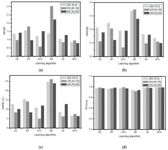 Performance parameters comparison of the different learning algorithms based on changes in the number of neurons and using three hidden layers. (a) RMSE; (b) NRMSE; (c) MAPE (%); (d) R value.