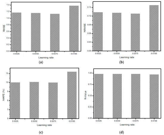 Performance parameters comparison of the GD algorithm for different learning rates. (a) RMSE; (b) NRMSE; (c) MAPE (%); (d) R value.