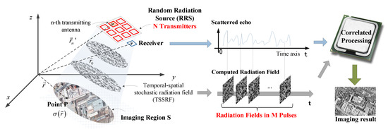 A typical geometry of MSCI including N transmitters and a single receiver is illustrated in Figure 1. The transmitting antennas are within a planar array located at a stationary platform. P is an arbitrary point in the 2-D imaging region S. , , and are the position vectors of the receiver, the n-th transmitting antenna, and the arbitrary point P, respectively. The RRS generates M pulses by simultaneous transmission of all the N transmitters, and temporal transient scattering echo is acquired by the single receiver. As a computational imaging technique, the imaging process of MSCI is to solve the backscattering coefficient from the imaging equation, which is formed by selecting out M TSSRF from the M pulses, meaning an independent observation is made by each pulse. The radiation fields in the imaging region are computed from predesigned parameters of RRS. By the correlated processing of calculated radiation fields and corresponding echo signals, the target within the imaging region is reconstructed via solving the imaging equation.